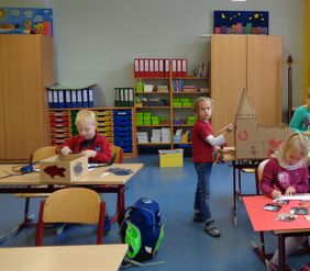 In der 3. Klasse musste zum Gestaltungstag nicht mehr viel erklärt werden. Mit Routine gingen die Kinder in zwei verschiedenen Klassenzimmern an die Arbeit. Es gab eine Menge interessante Ideen zu bestaunen, wie z.B. eine Jahreszeitenuhr, eine riesiger Lebkuchenmann oder ein selbst gebasteltes Schachbrett. Beim Vorstellen der Arbeiten lernten wir eine Menge dazu, z.B, wie gesund lachen ist oder wie viele Babys ein Igel bekommt. Wir konnten außerdem selbst Flugexperimente ausprobieren, Futter und Spielsachen von Katze und Hamster untersuchen und selbstgebackene Kekse vernaschen! Ein rundum gelungener Tag.