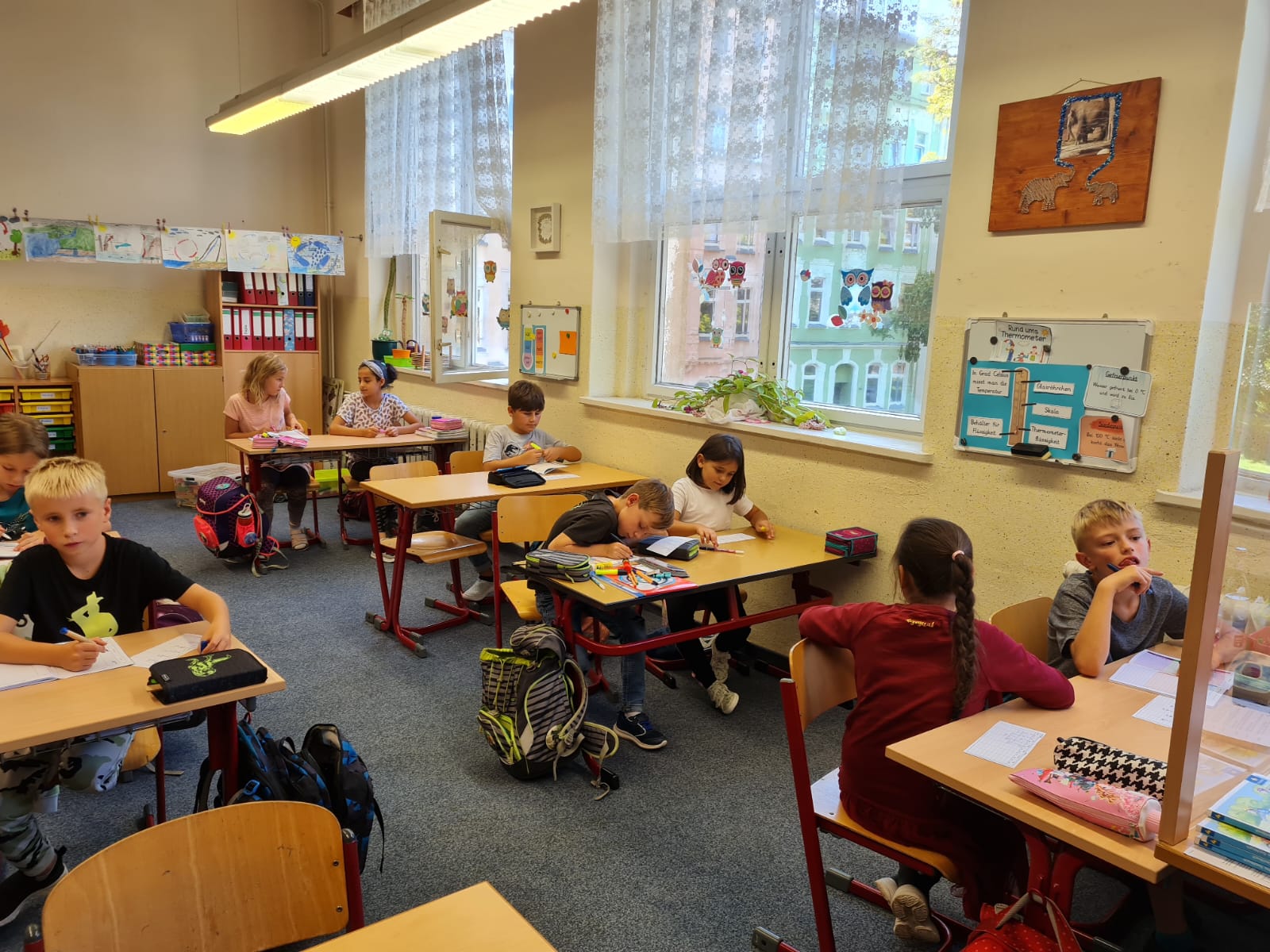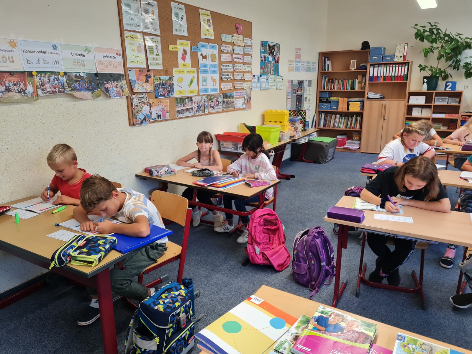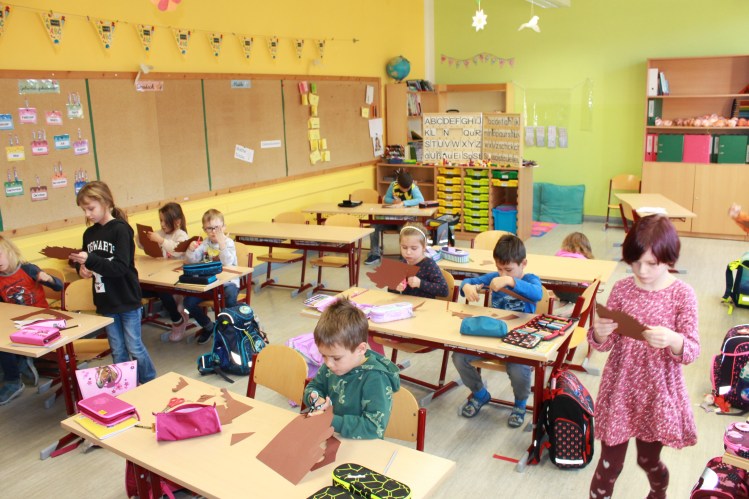 Nach der schönen Schulanfangsfeier hieß es für unsere Schulanfänger in den ersten Wochen Kennenlernen, erste Buchstaben und Zahlen schreiben, mit der Schere sauber schneiden und vieles mehr. Um die Kinder noch besser kennenzulernen ging es in Gruppen auf eine kleine Reise mit Frau Teuscher, Frau Sammler, Frau Meinhold und einem ganz besonders kleinen Gast. Gemeinsam mit der kleinen Hexe Mirola bereisten die Kinder einen gefährlichen Zauberwald. Da die Hexe nicht schreiben und lesen konnte, halfen sie ihr, gemeine Räuber zu bezwingen, Zauberkräfte beim Zauberer zu erlangen und hungrige Krokodile zu füttern. Die Kinder konnten der kleinen Hexe mit ihren eigenen Fähigkeiten helfen. So fädelten sie beispielsweise Ketten für den Räuber auf, legten Figuren nach, Sprachen Zaubersprüche und stellten ihre Balancierfähigkeiten unter Beweis.