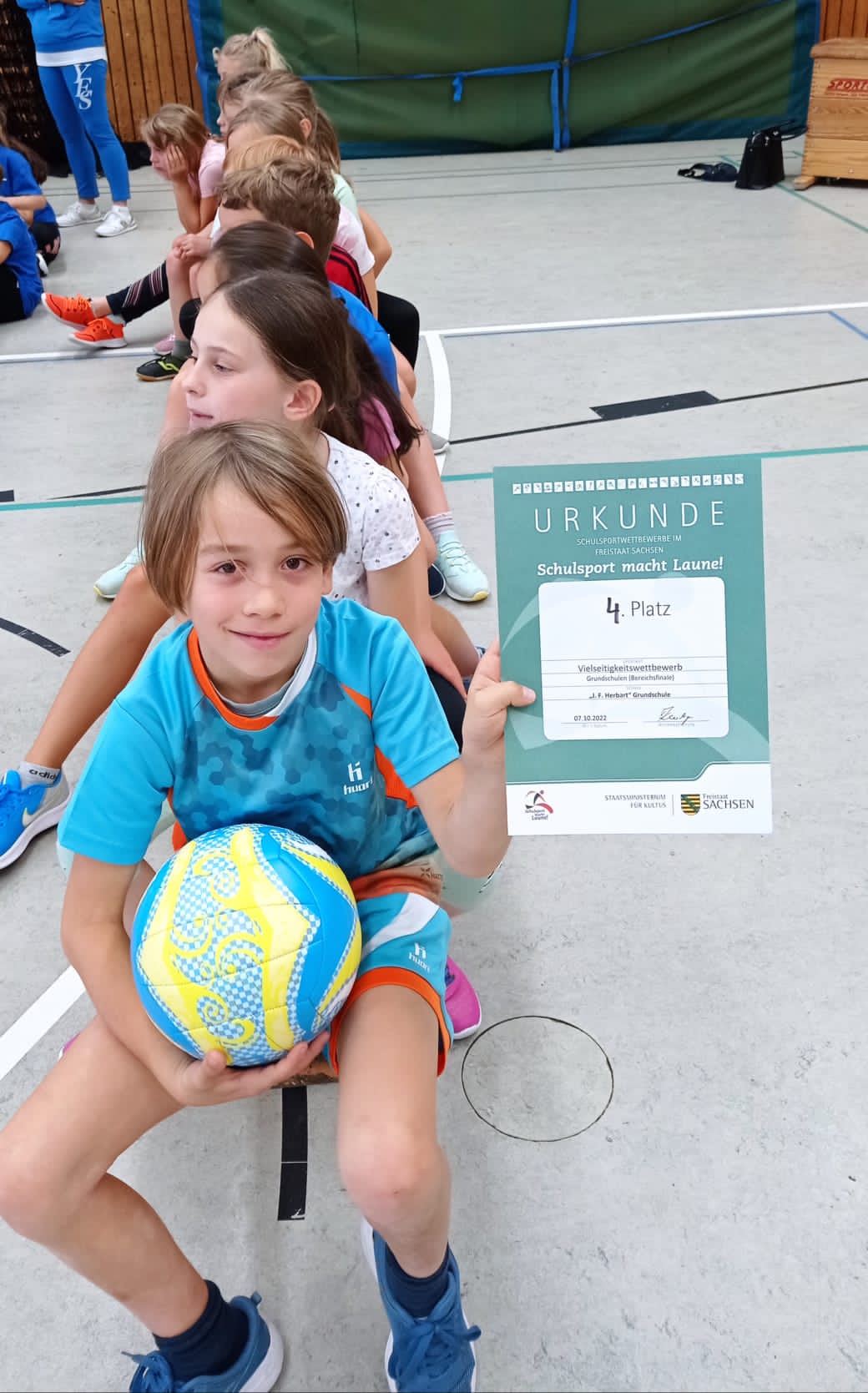 Am 07.10.2022 fand in der Kurt-Helbig-Sporthalle Plauen in der Sportart Leichtathletik ein Vielseitigkeitswettbewerb der Grundschulen statt. Unsere Schule belegte einen hervorragenden 4. Platz! Teilgenommen haben Schülerinnen und Schüler der Klassen 2-4. Vielseitiges Springen, Laufen, Rollen, Zielen und Werfen waren in unterschiedlichen Kombinationen von den Teilnehmern gefordert.